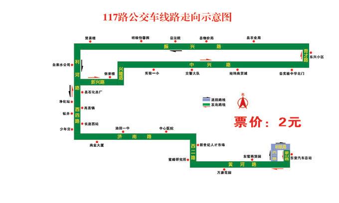 117路:自東營長途汽車總站始發(fā),途經蒙山路、黃河路、西二路、濟南路、西四路、利河路、新興路、興隆路、中興路、育才路、振興路、利河路、西四路、濟南路、西二路、黃河路、西一路、明鏡路、蒙山路、到達終點站東營長途汽車總站,票價不變,仍為2元/人次;