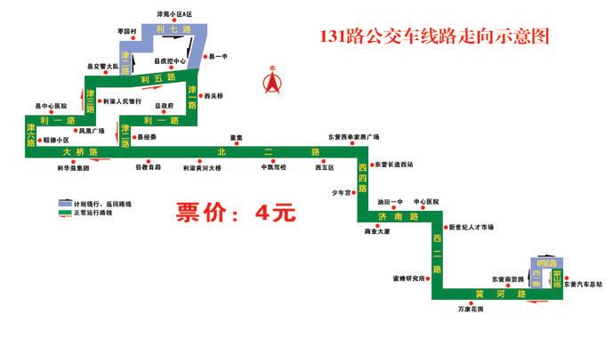 131路:自東營長途汽車總站始發(fā),途經蒙山路、黃河路、西二路、濟南路、西四路、北二路、大橋路、津六路、利一路、津三路、利五路、津一路、利一路、津二路、大橋路、北二路、西四路、濟南路、西二路、黃河路、西一路、明鏡路、蒙山路、到達終點站東營長途汽車總站,票價不變,仍為4元/人次。